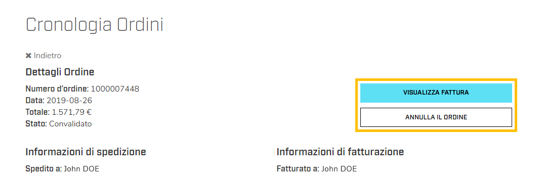 Cliccando il pulsante Visualizza su ciascun ordine, potrai visualizzarne il dettaglio. Inoltre potrai visualizzare la fattura o cancellare l'ordine.- Per qualsiasi altra informazione sullo stato dell'ordine, contatta il Servizio Clienti: